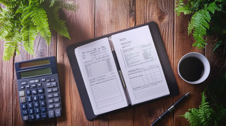 A flat lay of a workspace with an open financial ledger, a pen, and a calculator, symbolizing the organized and systematic management of money.