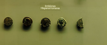 Collection of ancient Hispano-Roman coin emissions on display at the Merida Museum, Spain, showcasing a blend of Iberian and Roman numismatic history.