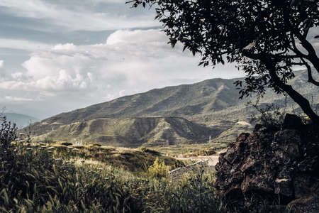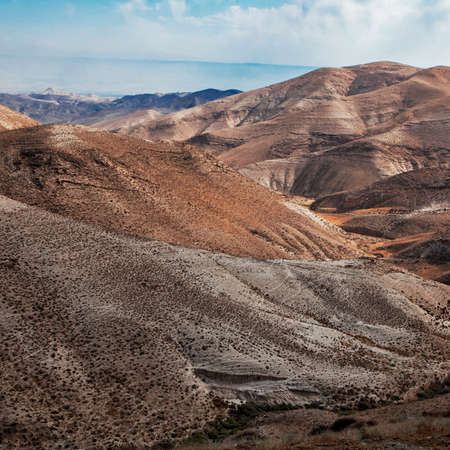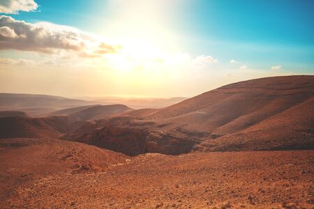 Mountain nature landscape. Desert in early morning. Beautiful sunrise in mountains. Judaean Desert. View of valley with mountains on backdrop. Nature Israel.