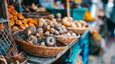 A market stall with baskets of assorted dried fruits, nuts, and seeds, arranged in an inviting display that highlights the abundance and diversity of natural products.