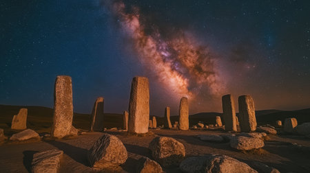 The Milky Way rising above ancient megalithic stones, creating a powerful astronomical alignment