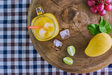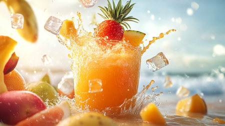 Tropical fruit cocktail in a glass with fruit pieces, a refreshing summer drink