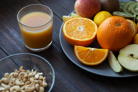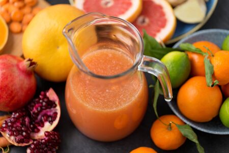 healthy eating, food and diet concept- close up of fresh juice glass and fruits on table
