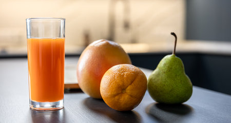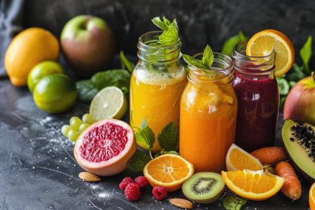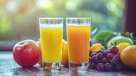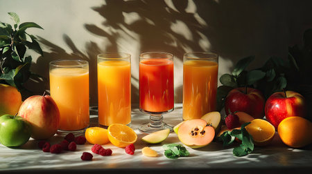 Bright apple and multivitamin juices in cocktail glasses, accompanied by a selection of fresh ripe fruits.