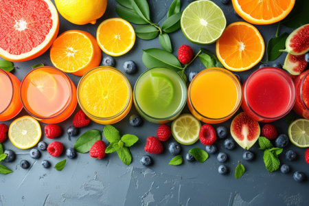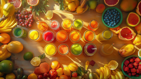 A top-down view of a colorful fruit juice bar with a variety of freshly squeezed juices in glass jars, surrounded by whole fruits.