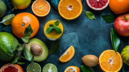 A variety of fresh citrus fruits and a glass of juice arranged on a dark surface. The vibrant colors and textures emphasize the freshness and health benefits of citrus fruits.