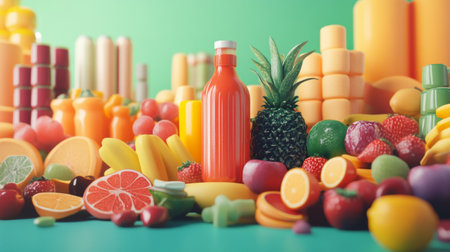 Vibrant arrangement of fresh fruits, including oranges, pineapples, and grapes, accompanied by bottles of colorful fruit juices in a bright setting.
