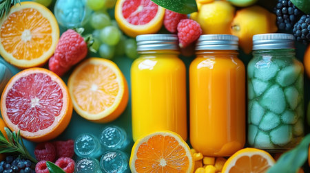 Two glass bottles filled with bright juices sit amid a lush display of oranges, blueberries, and raspberries, showing a delightful blend of colors and flavors in a summer-inspired feast.