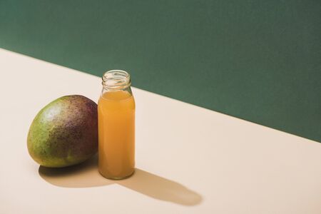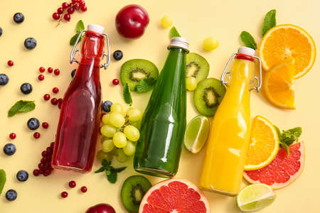 Bottles of fresh fruit juice and smoothie with fresh fruits