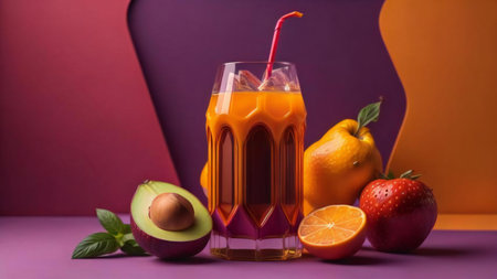 Fresh orange juice in a glass with a straw on a purple background. generative ai