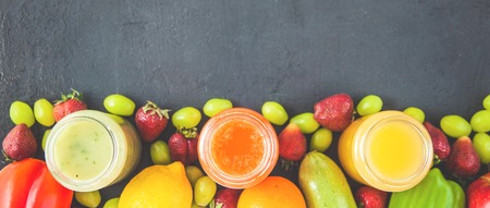 freshly squeezed fruit juice, smoothies yellow orange green blue banana lemon apple orange kiwi grape strawberry on a dark background Copy space. Flat lay Banner concept.
