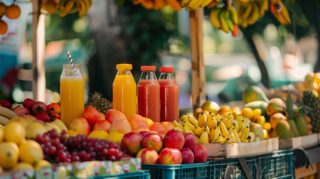 A farmer's market stall selling freshly squeezed fruit juices and smoothies made from locally sourced fruits, promoting healthy living and sustainability.