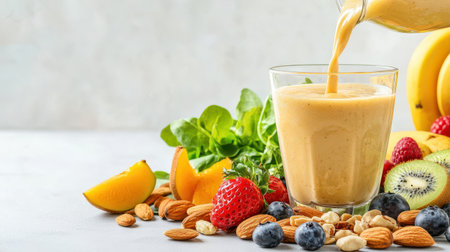 A smoothie being poured into a glass next to a spread of fruits, nuts, and greens, illustrating healthy nutrition choices.