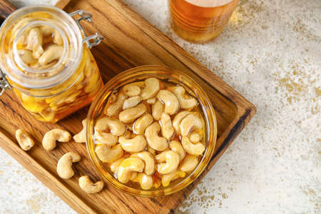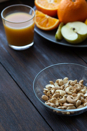 Cashew nuts scattered on the black table from a jar. Cashew nut is a healthy vegetarian protein nutritious food.