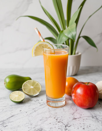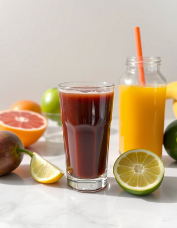 Two refreshing drinks of apple and multivitamin juices, with fresh ripe fruits beautifully arranged around them.