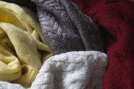 Autumn or winter background with warm sweaters. Pile of knitted clothes.