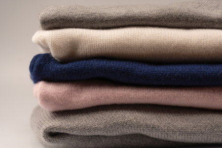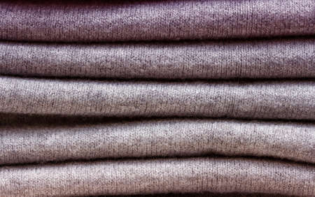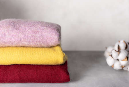 Winter warm woolen sweaters folded in a stack. Grey background copy space and empty place for your products. Cold time