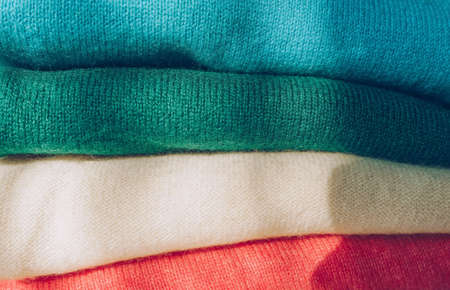Pile of knitted sweaters. Warm background, knitwear, space for text. Autumn winter concept. Background with sweaters