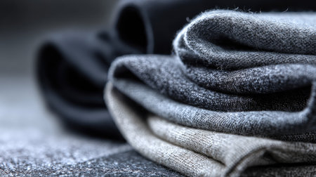 A close-up view showcasing rolled soft fabrics in varying shades of gray and black. Ideal for textiles, fashion, or interior design projects, this image highlights texture and luxury in a minimalistic aesthetic.
