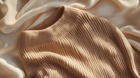 Beige ribbed sweater on silk fabric background, fashion and texture concept