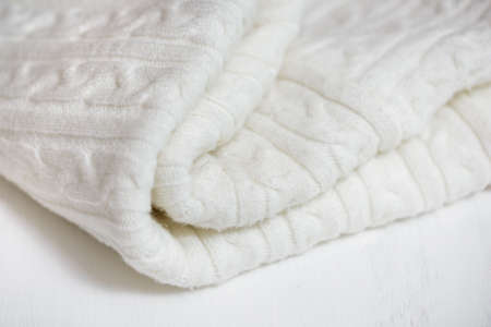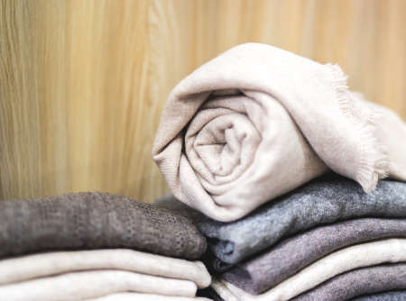 Folded knitted warm sweaters, half-overs or blankets. Autumn and winter clothes.