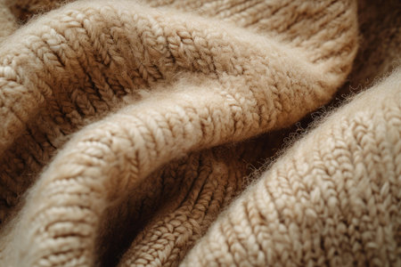 Close up of a soft knitted fabric revealing detailed patterns and textures. The warm beige color suggests comfort and elegance perfect for autumn wear.