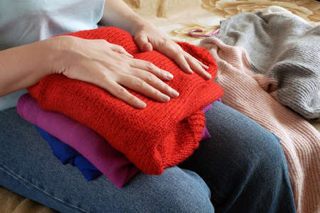 Woman fold clothes Washed Laundry And Clothes, Clothes for donation, closeup