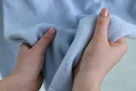 Woman touching clothes made of soft light blue fabric indoors, closeup