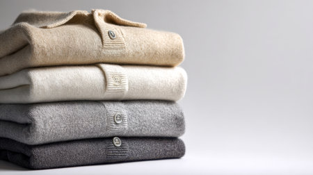 A harmonious arrangement of plush knitted sweaters in warm, natural shades highlights subtle textures and charming button accents, set against a sleek gray backdrop.