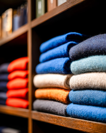 A vibrant display of folded sweaters in rainbow hues arranged on warm wooden shelves, evoking cozy chic in a stylish boutique setting.