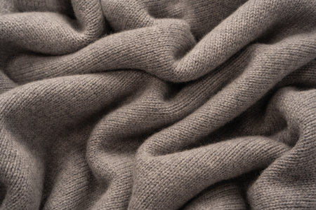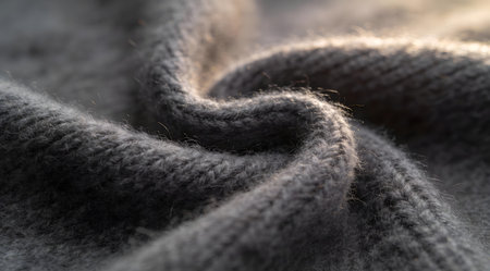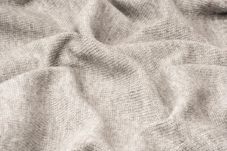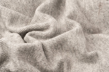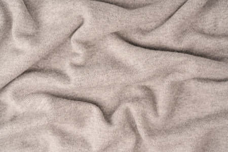 Wavy folds material. Knitted warm grey sweater or scaf. Cozy composition in the home atrosphere. Wool fabric texture close up background. Comfortable style cloth. Soft focus