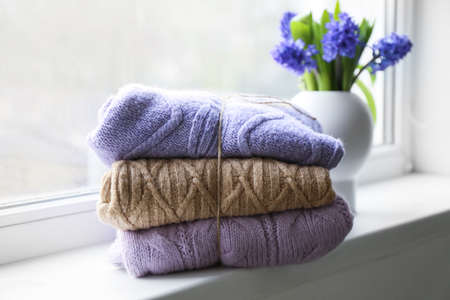 Stack of knitted sweaters and vase with flowers on windowsill in room, closeup