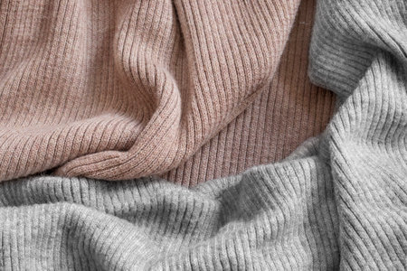 Knitted woolen beige and gray sweaters top view.