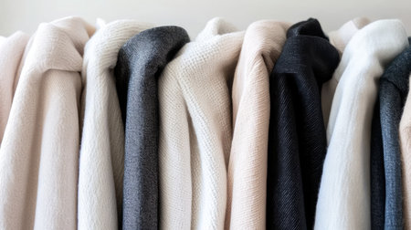 A beautiful display of cozy knitwear in neutral tones hanging on hangers, showcasing soft textures and stylish simplicity perfect for fashion inspiration.