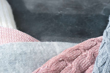 stack of folded various jumpers on a gray background. Cozy knitted clothes. place for text. close-up