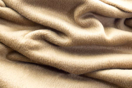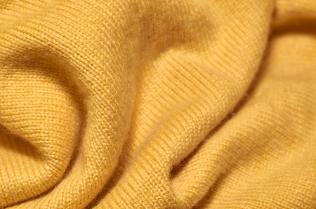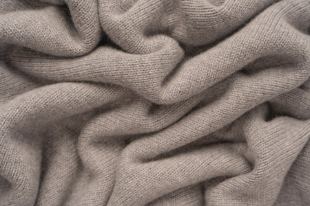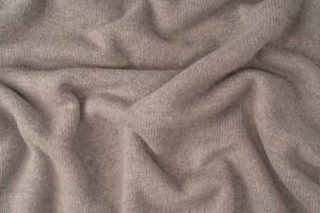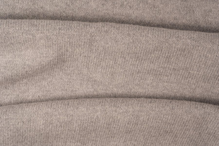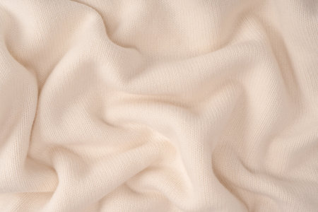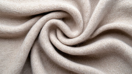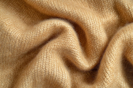 Close up of beige knitted wool fabric texture forming soft folds, creating a warm and cozy background for winter or autumn themes
