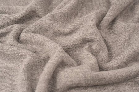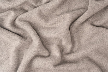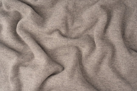 Wavy folds material. Knitted warm grey sweater or scaf. Cozy composition in the home atrosphere. Wool fabric texture close up background. Comfortable style cloth. Soft focus