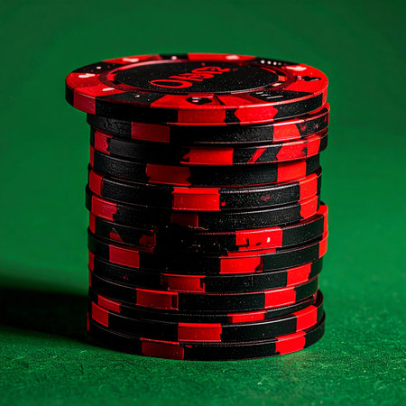 Close-up view of colorful casino chips stacked on a gaming table. The dramatic lighting enhances the tension and excitement of gambling, creating a vibrant atmosphere.