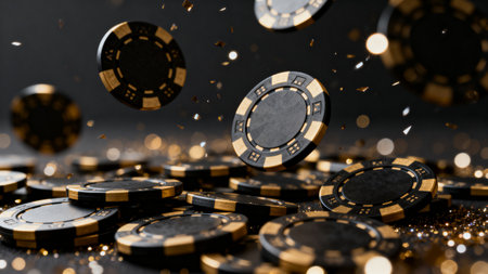 Close-up of black and gold poker chips on a table with a bokeh background of gold lights.