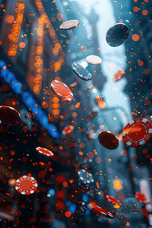 Photorealistic close-up of colorful casino chips, highlighting a vibrant and dynamic atmosphere in a gambling environment, emphasizing excitement and anticipation.