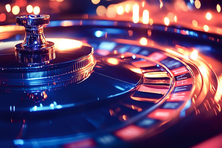 Casino roulette wheel spinning with colorful blurred lights in the background, creating an exciting and glamorous atmosphere of gambling and entertainment