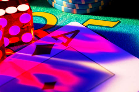 Ace of diamonds, set chips and dice on poker game table in casino. Poker set close up. Red blue light falls on game card. Concept of gambling, casino betting. Entertainment in a gambling club.