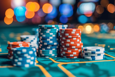 Colorful stacks of poker chips are arranged on a casino table, creating a lively atmosphere for players engaged in the game.