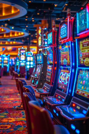 Vibrant casino atmosphere featuring poker chips, roulette players, and colorful slot machines