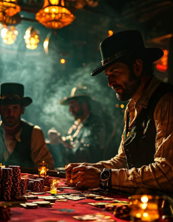 Players engage in a high-stakes poker game, with stacks of colorful chips and cards spread across a bustling casino table under dim lights.