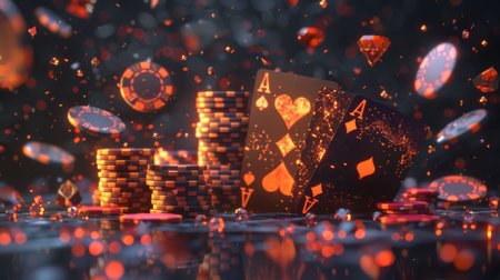 Stacks of colorful poker chips and playing cards are set against a vibrant backdrop, capturing the excitement of a casino gaming night.