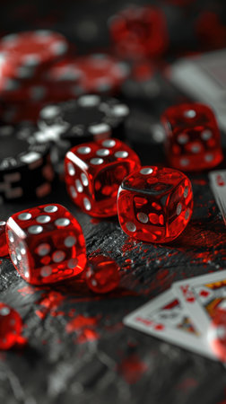 Symbols of Wealth and Gambling: Casino Chips, Cards, and Dice on a Dark Background. Concept Wealth, Gambling, Casino, Chips, Cards, Dice, Dark Background