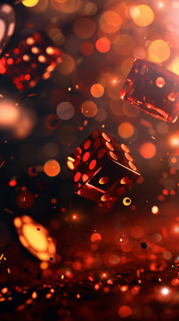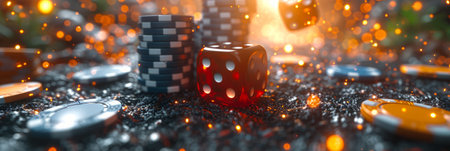 Close-up of gaming dice and chips against the backdrop of a luxury casino. Betting concept. Generative AI.