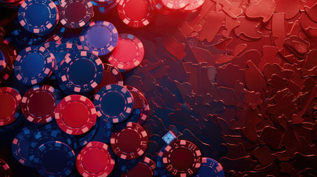 A close-up of scattered poker chips, showing the thrill and vibrant energy of a casino setting.