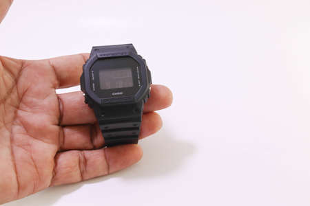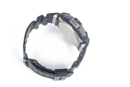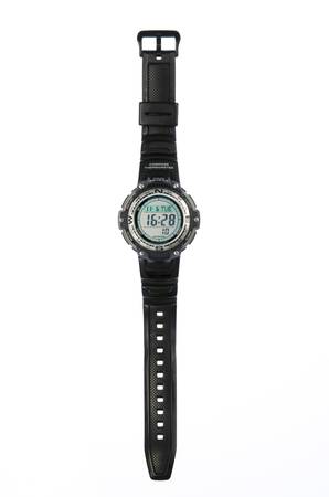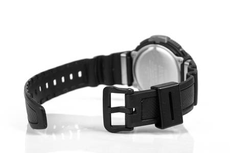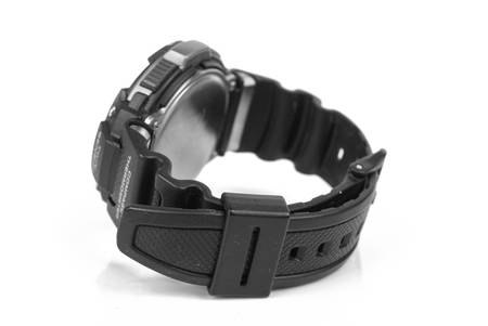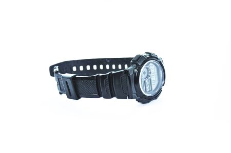 Black digital wrist watch. On white background.